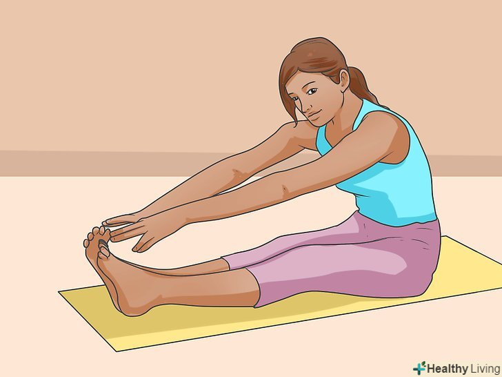 - Сядьте на підлогу і зніміть взуття, тримайте пальці ніг руками і обережно потягніть їх вгору до тих пір, поки не відчуєте розтягнення зводу стопи. Зафіксуйте положення на 30 секунд, поміняйте ноги і повторіть вправу.[16]