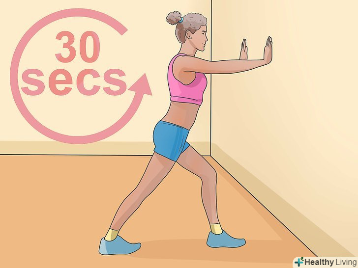 - Виконуйте три вправи на розтяжку до і після тренування. Перша вправа: встаньте до стіни обличчям, упріться обома руками в стіну, одну ногу поставте ближче до стіни.[14]