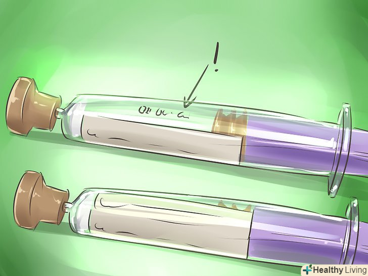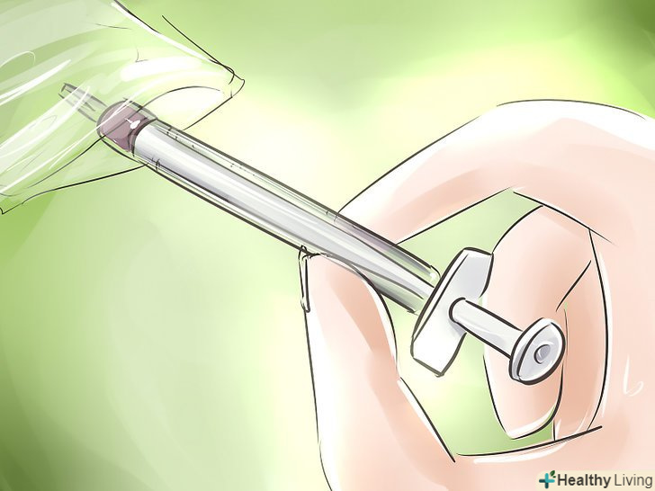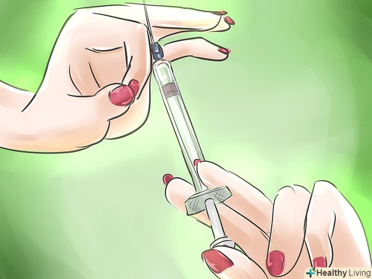 Злегка натисніть на шприц, щоб випустити бульбашки повітря.після чого натисніть на рукоятку шприца, поки невелика кількість рідини не підійде до голки так, щоб в шприці не залишилося повітря.