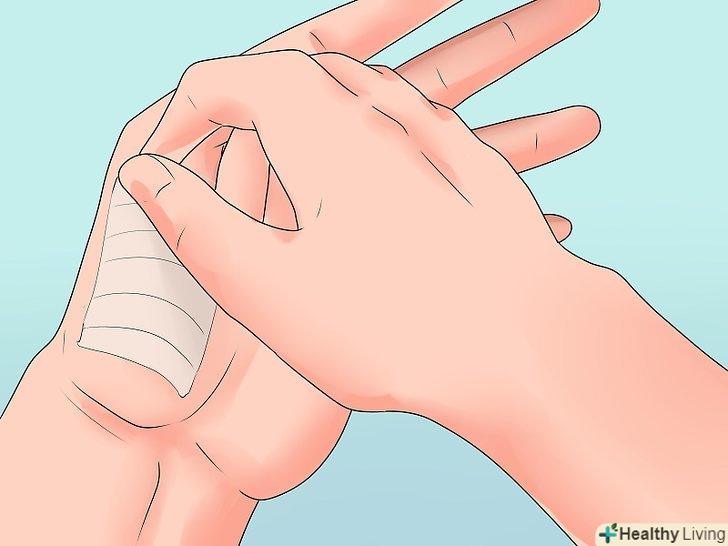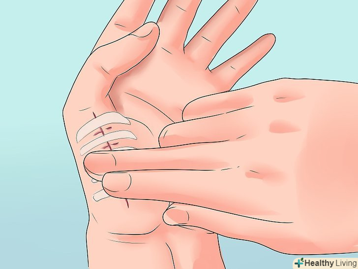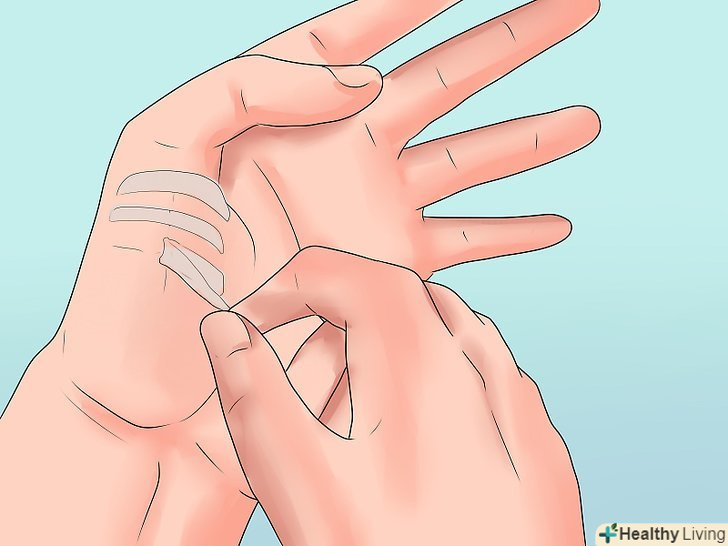 Приклейте Додаткові смужки паралельно рані так, щоб вони прикривали кінці основних смужок.додаткові смужки закріплять кінці основних, щоб вони не відклеювалися. Завдяки такій подвійній фіксації рана буде закрита до тих пір, поки повністю не заживе. Додаткові смужки наклейте на відстані приблизно 1 см від основних смужок.[9]