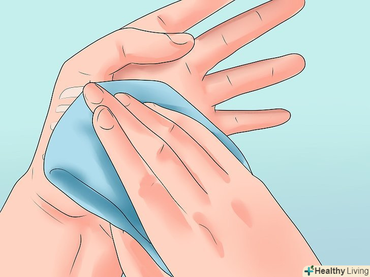 Очистіть і просушіть шкіру навколо рани (приблизно 5 см).змийте кров і бруд навколо рани медичним спиртом або іншим дезінфікуючим засобом. Намочіть засобом чистий ватяну кульку і обробіть їм всю область навколо рани.[1]