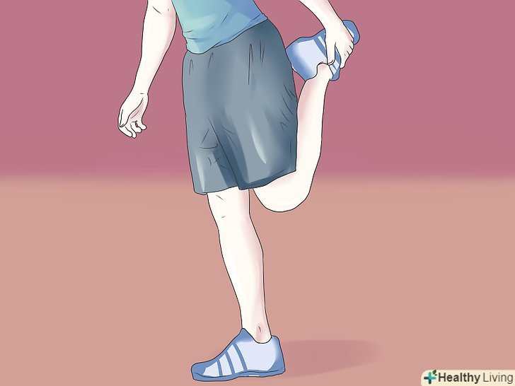 Пасивна розтяжка.пасивна розтяжка допомагає поліпшити гнучкість м'язів і зв'язок під час затримки після вправ. Така розтяжка квадрицепсів-хороший варіант пасивної розтяжки, що допомагає зберігати еластичність МКС, що дуже важливо, щоб уникнути пошкоджень:- Встаньте біля стіни, для рівноваги притисніть до неї долоню правої руки. Згинаючи коліно, але не згинаючи стегна, відведіть назад і підніміть праву ступню, так, щоб п'ята стосувалася лівої сідниці. Лівою рукою притискайте і утримуйте ступню протягом 30-60 секунд. Виконайте те ж з іншою ногою.
