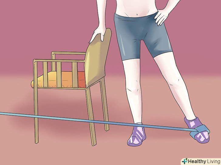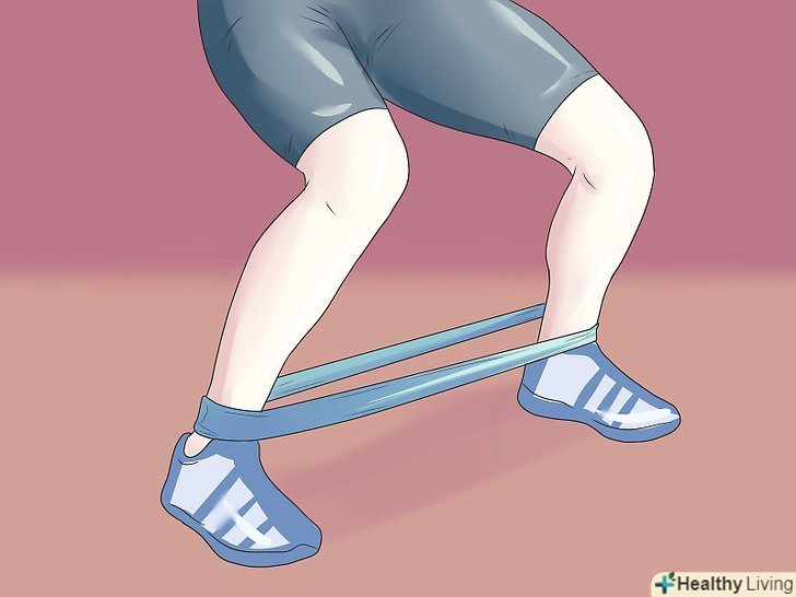 Вправи з еластичними гумовими стрічками або джгутами.вправи з еластичними стрічками це відмінний спосіб розробити МКС, оскільки стрічка створює тиск із зовнішнього боку коліна, що в свою чергу змушує МКС вигинати коліно назовні. Це створює той тип навантаження, якої МКС схильна при нормальній фізичній активності. Використання стрічки:- Натягніть стрічку або джгут навколо щиколоток і встаньте рівно, розставивши ноги на ширину стегон, шкарпетки дивляться вперед. Тримайте спину прямо і коліна злегка зігнуті.