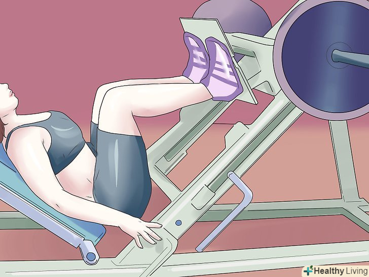 Скористайтеся тренажером жим для ніг.більшість тренажерних залів оснащено такими тренажерами, вони прекрасно зміцнюють м'язи, що оточують коліно, включаючи медіальну широку м'яз стегна, надають підтримку МКС. Використання тренажера жим для ніг:- Сядьте в тренажер, лежачи упріться спиною до спинки тренажера, яка встановлена під нахилом в 30 градусів, і поставте ноги ступнями на вертикальну площину перед собою.