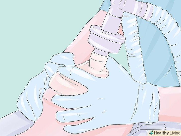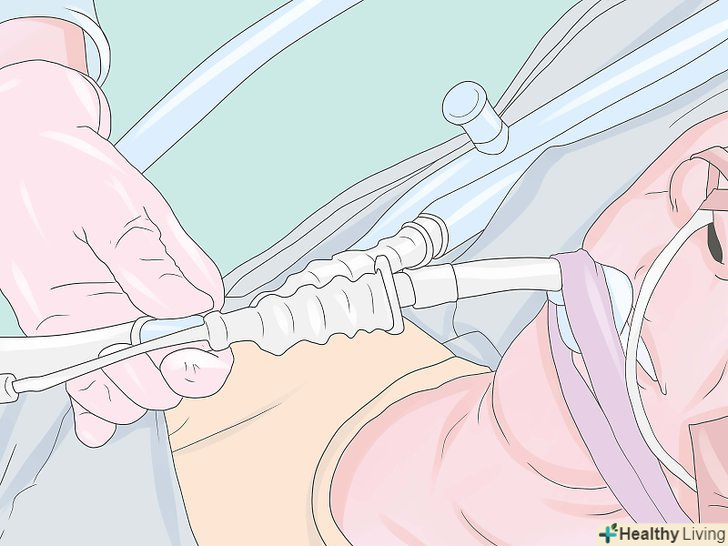 Інтубуйте пацієнта (оберігайте дихальні шляхи).використовуючи вашу ліву руку в рукавичці, вставте ларингоскоп, щоб візуалізувати надгортанник і голосові зв'язки, а потім вставте ендотрахеальну трубку (ЕТТ) через відтягнуті голосові зв'язки правою рукою. Зазвичай ендотрахеальна трубка повинна бути розташована від губ близько 21 см для жінок і 23 см для чоловіків. Накачайте манжету ендотрахеальної трубки тиском 25 см Н2О, щоб встановити ущільнення (близько 5 мл повітря, як правило, достатньо), потім підключіть ендотрахеальну трубку в дихальний контур пацієнта. Перевірте стетоскопом сталість входу повітря і правильність з'являються капнограм. (Якщо використовується гортанна маска дихальних шляхів, вона вставляється без ларингоскопа).