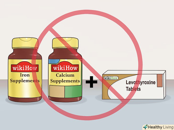 На час прийому ліків відмовтеся від прийому певних добавок.Добавки заліза і кальцію можуть погіршити здатність організму поглинати ліки. Вам також варто триматися подалі від ліків, до складу яких входить холестирамін і гідроксид алюмінію.[9]- Перш ніж почати приймати ліки для щитовидної залози, вам варто проконсультуватися з лікарем на той випадок, якщо ви приймаєте будь-які інші ліки або харчові добавки.