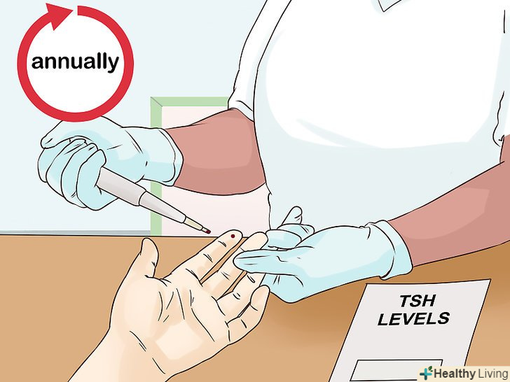 Щорічно перевіряйте свій рівень ТТГ.проходьте щорічне обстеження у лікаря, щоб переконатися, що тиреотропний гормон знаходиться на належному рівні. Лікар повинен як мінімум раз на рік перевіряти ваш рівень ТТГ, щоб переконатися в ефективності ліки.[13]- Якщо ви перейшли на нове дозування левотироксину, вам варто перевірятися частіше, ніж раз на рік.