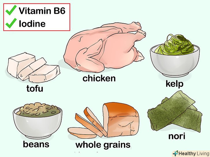 Споживайте продукти, багаті вітаміном В і йодом.Ваш раціон повинен складатися з корисних джерел білка, таких як тофу, курка і квасоля, а також продуктів, багатих вітаміном В (продукти з цільного зерна, горіхи і насіння). Включіть в свій раціон рівну кількість фруктів і овочів (особливо морських, оскільки вони містять велику кількість йоду). Продукти з високим вмістом йоду корисні для щитовидної залози.[14]- Спробуйте принаймні один раз на день їсти морські водорості, такі як морська капуста, норі та комбу. Додайте морську капусту в салат або суп, щоб збільшити вміст йоду в своєму раціоні. Комбу можна додавати в квасолю або м'ясо. У норі можна загортати на зразок ролів найрізноманітніші продукти.