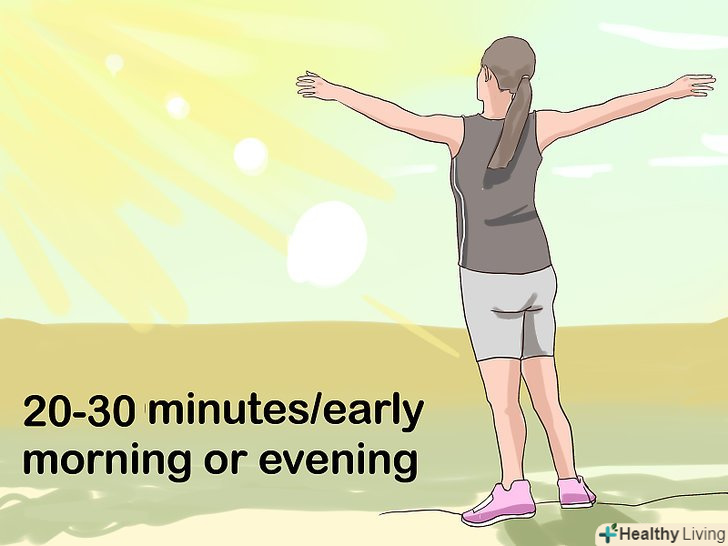 Щодня споживайте достатню кількість вітаміну D. намагайтеся рано вранці або ввечері хоча б на 20-30 хвилин виходити на сонце. Встаньте обличчям до сонця і насолодитеся його променями. Низький рівень вітаміну D пов'язують з гіпотиреозом; Підвищіть його рівень, і, можливо, вам стане краще.[16]- Якщо ви живете в регіоні з недоліком прямого сонячного світла (особливо взимку), проконсультуйтеся з лікарем з приводу прийому добавок вітаміну D.