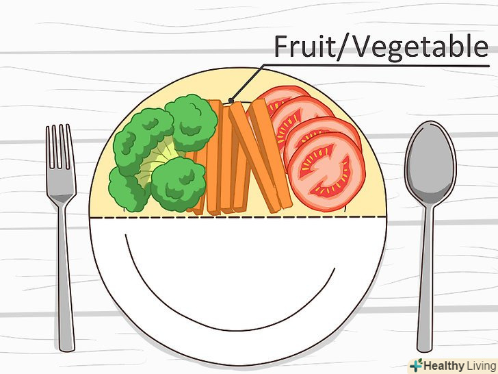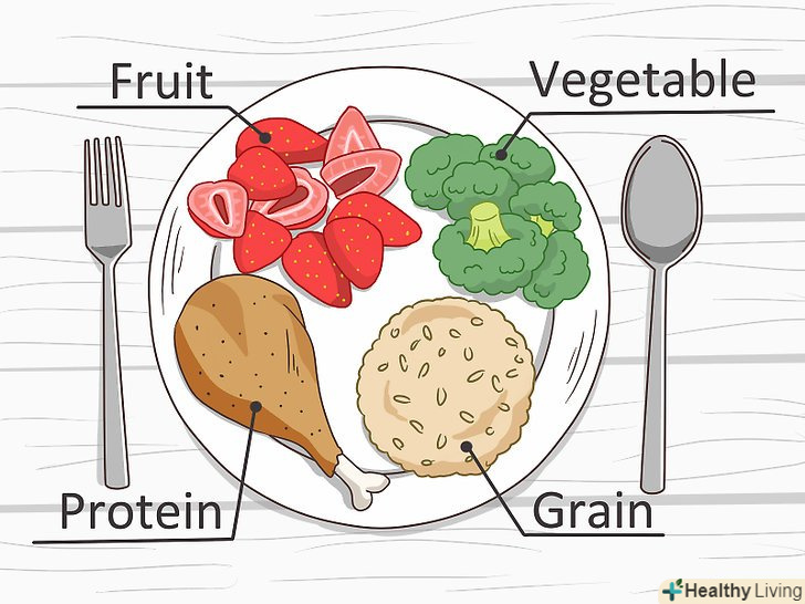 - Збалансоване харчування має на увазі правильні пропорції або розміри порцій їжі.[6] не можна назвати раціон збалансованим, якщо він складається головним чином з білків і практично виключає овочі з фруктами. Дотримуйтесь рекомендовані розміри порцій для продуктів кожної групи: 80-120 грамів (розміром з колоду карт) білків,[7] 150 грамів овочів або зелені,[8] 75 грамів подрібнених фруктів або один невеликий фрукт,[9] а також 80 грамів злаків.[10]