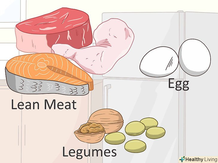 Вибирайте пісний білок.білок відноситься до найважливіших поживних речовин. Він покликаний забезпечувати складові елементи безлічі функцій організму, а також підтримувати суху м'язову масу, відновлювати клітини і підтримувати імунну систему.[12]- Основні джерела пісного білка: м'ясо птиці, яйця, морепродукти, нежирна яловичина і свинина, бобові, горіхи і тофу.