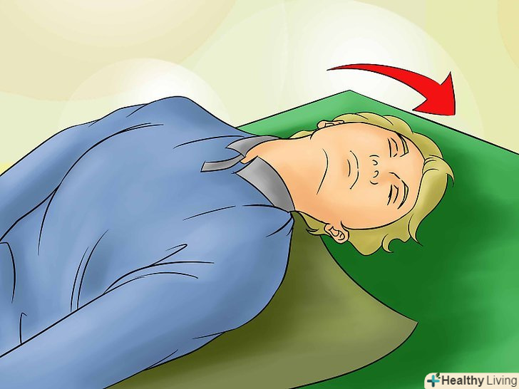 Сядьте на край ліжка.поверніть голову вліво на 45 градусів і покладіть ззаду себе подушку, щоб вона виявилася між плечима, коли ви ляжете на ліжко, а не під головою.