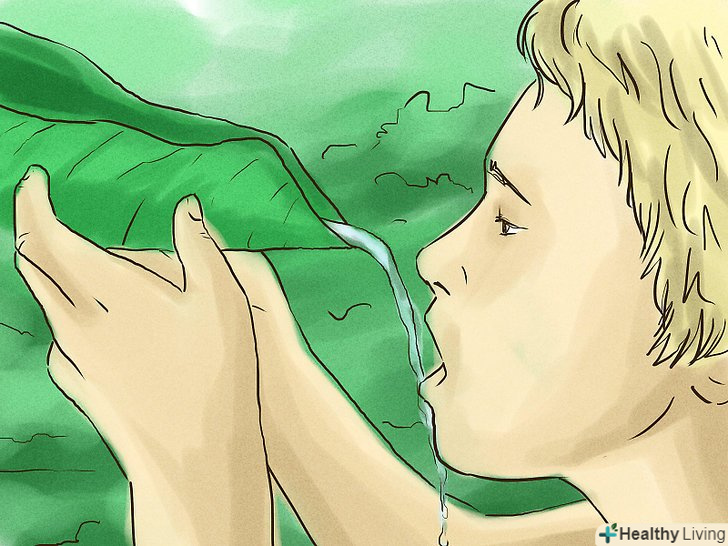 Видобувайте питну воду.якщо вам не вистачає прісної води, можливо, вам вдасться добути її. Застеліть свій пліт або інший плаваючий засіб брезентом або целофаном і збирайте дощову воду. Таким же чином можна збирати ранкову росу, якщо немає дощу.[11]- Ні в якому разі не пийте солону воду, так як це призведе до зневоднення. Замість цього постарайтесязробити з солоної води прісну.