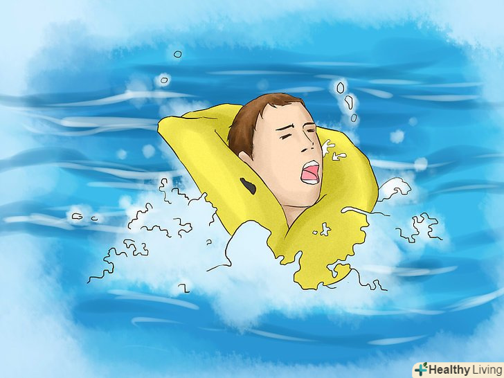 Уникайте гіпотермії.якщо ви не потонули при аварії корабля, вам загрожує наступна серйозна небезпека — гіпотермія, тобто переохолодження. Холодна вода знижує температуру тіла. Якщо температура тіла падає занадто низько, в кінці кінців відмовляють різні органи, і людина вмирає.- Якщо ви тримаєтеся за якийсь плаваючий предмет і перебуваєте у воді, а не на плоту, підніміть коліна до грудей. Це допоможе зберегти тепло.