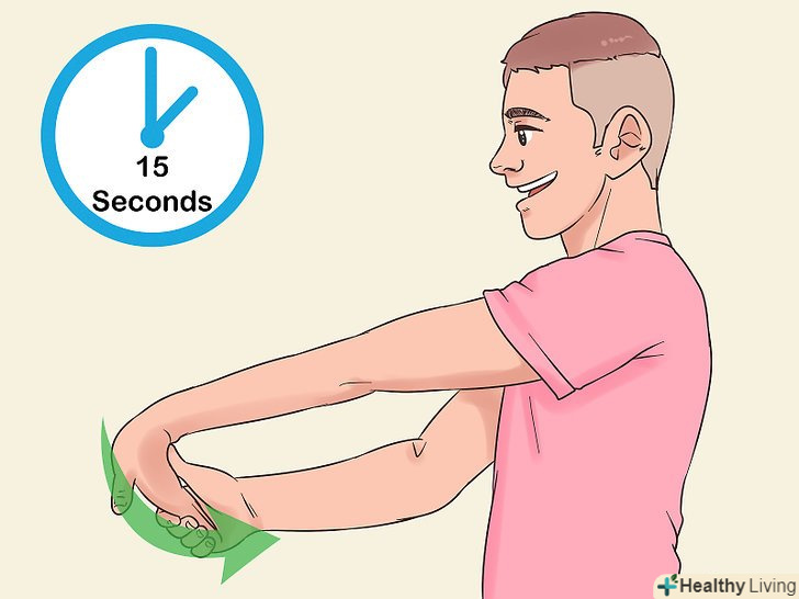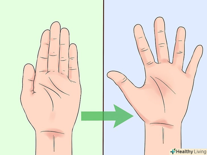 Візьміться другою рукою за пальці першої і потягніть їх вгору.витягніть робочу руку і підніміть долоню так, як ніби ви подаєте комусь сигнал зупинитися. Потім візьміться другою рукою за кінчики пальців і обережно потягніть їх до себе, так щоб долоню відігнулася назад ще більше. Утримуйте її в такому положенні близько 15 секунд.[10]- Виконайте вправу для обох рук.