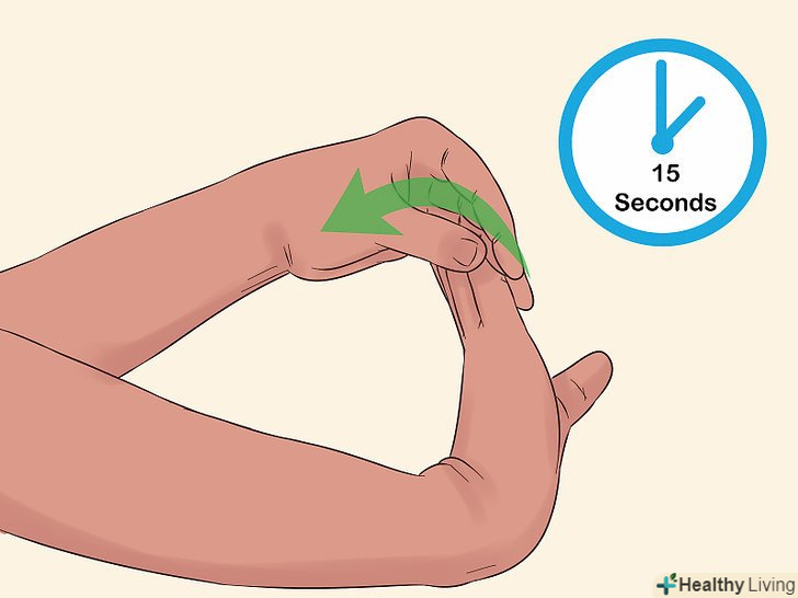 Візьміться другою рукою за пальці першої і потягніть їх вниз.витягніть одну руку перед собою долонею вгору. Візьміться другою рукою за кінчики пальців і обережно пригніть їх вниз, до себе. Утримуйте їх в такому положенні приблизно 15 секунд.- Дану вправу можна виконувати і так, щоб долоню була спрямована від вас, а пальці витягнуті вгору. В цьому випадку також слід тягнути пальці до себе.