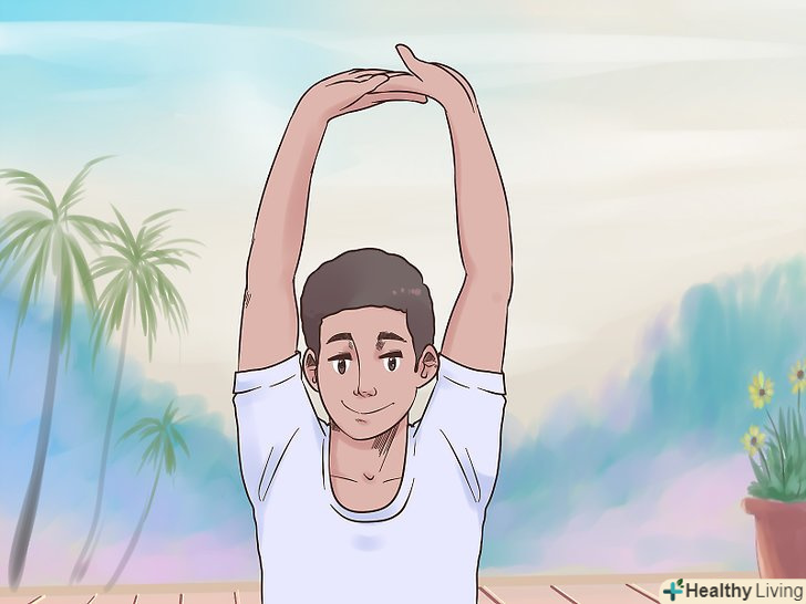 Сплетіть пальці і витягніть руки.при цьому долоні повинні бути спрямовані від вас. Просто сплетіть пальці обох рук, направте долоні від себе і витягніть руки до стелі. Слідкуйте, щоб спина і плечі залишалися прямими.[11]- Утримуйте таку позу 10-15 секунд.