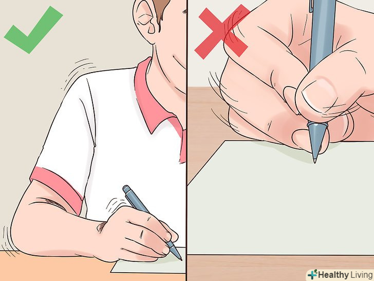 Пишіть рукою, а не пальцями.Пам'ятайте, що це не малювання! Тримайте долоню і зап'ястя на місці і рухайте всією рукою за допомогою ліктя і плеча (як ніби ви пишете на дошці). Не користуйтеся при цьому м'язами пальців-хоча це і може здатися дивним, але функція пальців полягає лише в тому, щоб утримувати ручку або олівець.[6]- Найчастіше ручку або олівець кладуть між вказівним і середнім пальцями, а великим пальцем утримують їх на місці. Можна також покласти поверх ручки середній і вказівний пальці, а великим підтримувати її знизу.[7]