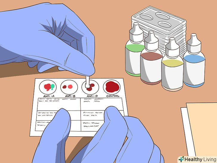Купіть набір для самостійного визначення групи крові.якщо у вас немає бажання йти до лікаря або здавати кров, можна купити набір для визначення групи крові. Такі набори продаються в інтернеті або в аптеках. У наборі повинна бути інструкція, згідно з якою вам знадобиться нанести на спеціальну картку розчин і додати кілька крапель крові. Уважно дотримуйтесь інструкції, коли додаєте спеціальні розчини на патчі в певні місця, де має відбутися утворення грудочок (аглютинація). Після проведення тесту визначте групу крові згідно таблиці:[4]Використання спеціального набору для визначення групи крові