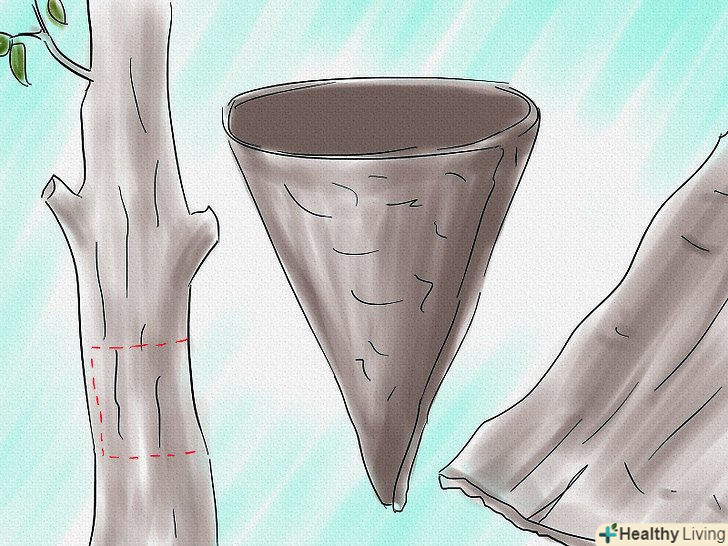 Зробіть конус з смужки кори.березова кора (або схожа на неї) найкраще підходить для створення системи фільтрації через її гнучкості і здатності зберігати форму. Пам'ятайте, що цим способом не вийде повністю очистити воду, але кількість мікробів істотно зменшиться. Цей спосіб слід використовувати тільки в надзвичайних обставинах. [12]- Якщо у вас не виходить згорнути кору конусом, візьміть шматок мотузки або міцної трави і зав'яжіть навколо конуса, щоб утримати його форму.