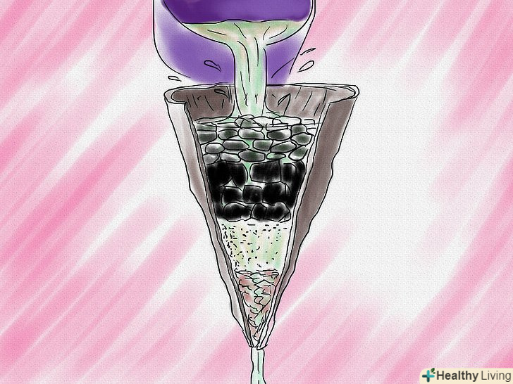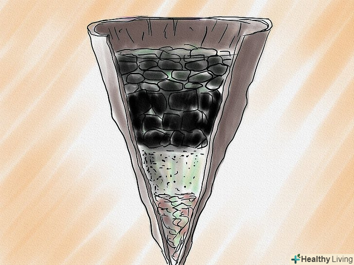 Наповніть конус.посібники з виживання в диких лісах радять наповнювати конус піском, вугіллям, травою і гравієм (або дрібними каменями). Вугілля особливо хороший для відсіювання бактерій. Якщо у вас є багаття, розламайте трохи згорілих шматків деревини. [13]