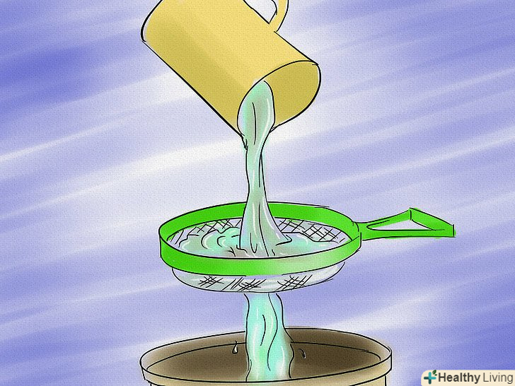 Процідіть воду, якщо в ній плавають великі частинки.це можна зробити, пропустивши воду через ганчірку в пляшку або ємність, в якій ви будете її знезаражувати. Тканина працює як сито, яке затримує частинки, що плавають у воді. [6]
