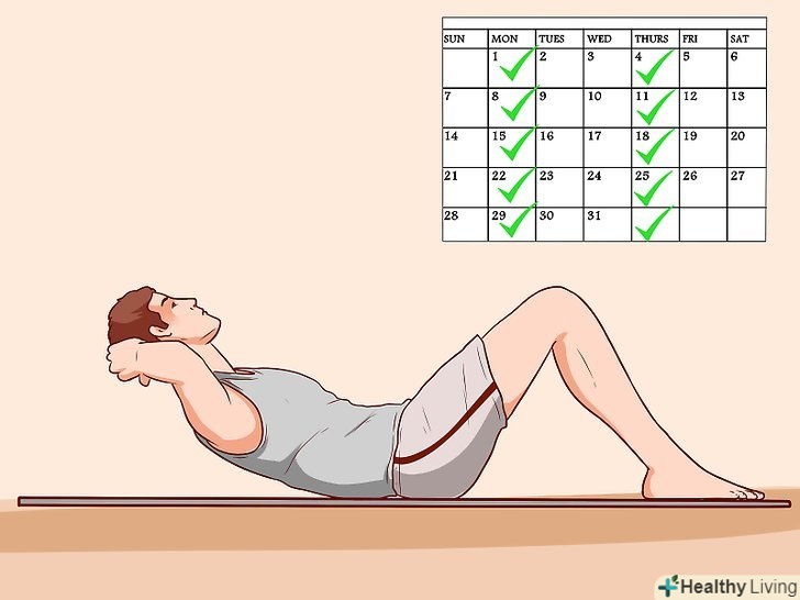 Виконуйте силові вправи.силовим тренуванням слід присвячувати не менше двох днів на тиждень. Підберіть вправи, які допоможуть вам зміцнити м'язи спини, живота і ніг і зробити їх більш гнучкими. Все це знизить ймовірність протрузії дисків. Спробуйте виконувати присідання, стискати стегна, стояти в планці і підніматися на руках в положенні лежачи.[4]- скручування. Ляжте на спину, зігніть ноги в колінах і почніть піднімати корпус разом з плечима на 8-20 сантиметрів над підлогою. Вдихайте на русі вниз і видихайте на русі вгору. Повторіть 8-10 разів. Руки повинні бути схрещені на грудях.