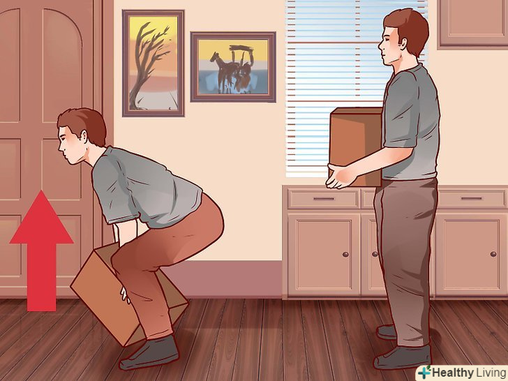 Піднімайте тяжкості правильно.підйом важких предметів-це основна причина травм спини, включаючи протрузію дисків. Переносьте вагу на ноги, а не на спину. Станьте якомога ближче до предмету, який потрібно підняти, широко розставивши ноги для рівноваги. Нахиліться, зігнувши ноги в колінах, і почніть піднімати предмет за рахунок великих м'язів в ногах. Тримайте предмет якомога ближче до себе, щоб не перенапружувати спину.[17]- Не згинайте спину в області талії!