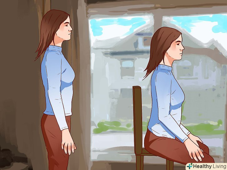Слідкуйте за поставою.правильна постава дозволить тримати голову, плечі і стегна на одному рівні і знизить навантаження на хребет, а через неправильну поставу спина буде перенапружуватися. При ходьбі і в стані спокою тримайте корпус прямо, відводите плечі назад і втягуйте живіт. Якщо вам потрібно сісти, підкладіть під спину подушку або інший предмет, який буде підтримувати хребет, якщо у вас немає спеціального крісла. Ноги повинні або стояти на підлозі, або перебувати в піднятому положенні.[18]- Щоб підняти ноги, поставте поруч з собою спеціальний табурет для ніг.