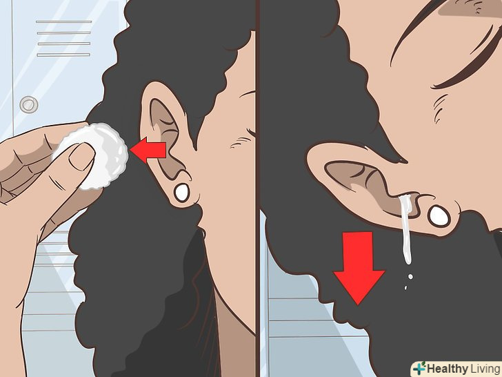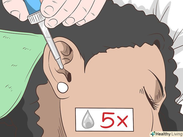 Влийте в вухо 1-3 мл 3% перекису водню.наберіть піпеткою 1-3 мл 3% розчину перекису водню і закапайте в вушний канал.[2] перекис водню буде шипіти-це нормально. Хоча може бути трохи лоскотно, намагайтеся не напружуватися. Лежіть нерухомо протягом 3-5 хвилин, щоб розчин не витік з вуха.[3]- Щоб легше було закопувати перекис, відтягніть верхній край вуха, відкривши доступ до вушного каналу.