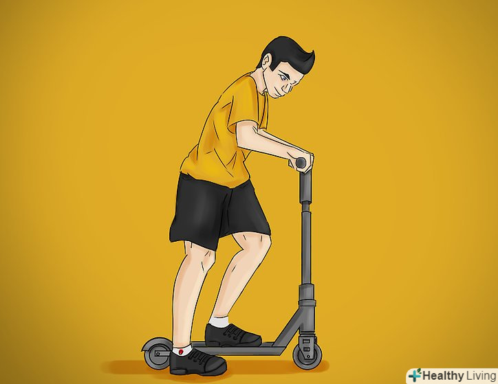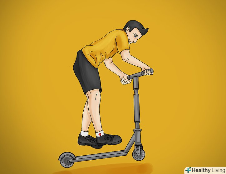 - Потренуйте фліп п'ятою. щоб зробити фліп п'ятою або «фальшивий хлист», вам потрібно виконати в основному те ж саме рух, але повернути самокат в протилежному напрямку, тобто вперед, а не назад. Зупиніть рух самоката ногою, що стоїть на ньому, і приземлите іншу ногу як зазвичай.