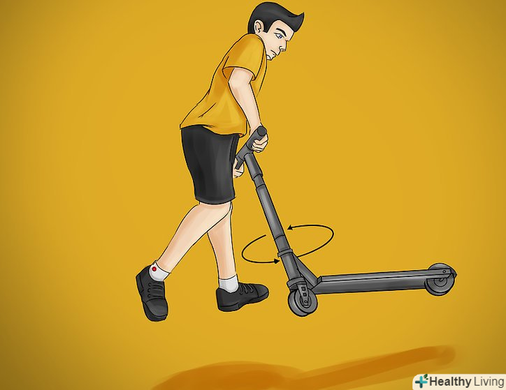 Приземліться. коли самокат опиниться під ногою – станьте на нього і докрутіть залишився коло, а потім ставте іншу ногу, як Вам зручно.- Знадобиться багато практики. Зупиніть обертання самоката ногою, яка стоїть на ньому, перед тим як загальмувати іншою ногою об землю.