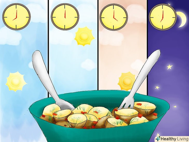 Їжте одночасно. коли ви голодні, ви нервуєте ще більше і з більшою ймовірністю з'їсте те, що насправді тільки підвищить рівень стресу, а не знизить його. Але якщо ви візьмете в звичку їсти регулярно в один і той же час, ви зможете побороти стрес за допомогою їжі, оскільки будете забезпечувати організм всіма необхідними поживними речовинами і тоді, коли йому це потрібно.[8]- Хоча не обов'язково їсти відразу після пробудження, але снідати потрібно обов'язково.