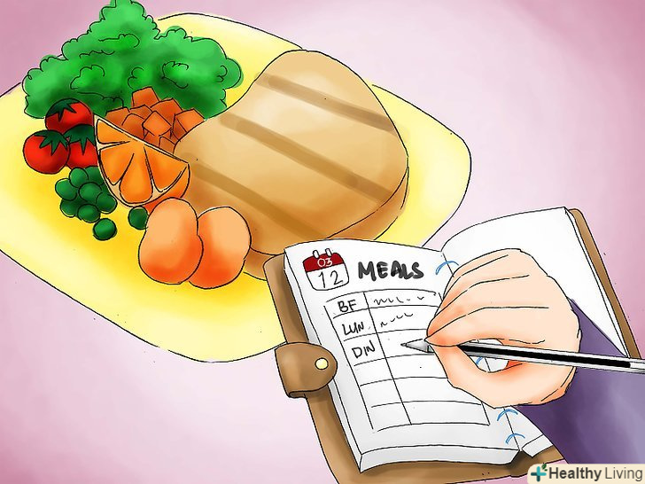 Плануйте прийоми їжі.якщо ви будете планувати і готувати прийоми їжі заздалегідь, це дасть вам можливість вибирати продукти, які допоможуть організму боротися зі стресом.[9] оскільки в такому випадку ви вже заплануєте, що будете їсти, то з меншою ймовірністю з'їсте те, що підвищить ваш рівень стресу.- Щотижня думайте про те, які прийоми їжі у вас будуть, щоб задовольнити всі потреби в харчуванні протягом тижня.