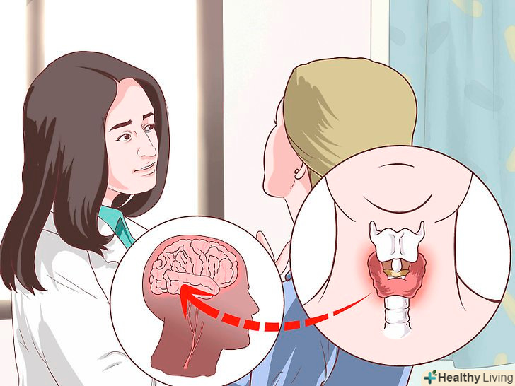 Симптоми можуть бути викликані і зовсім іншим захворюванням.не забувайте, що вищезгадані симптоми можуть бути викликані не тільки проблемами з щитовидною залозою. Визначте, чи присутній у вас безліч симптомів або лише кілька. Якщо ви не впевнені, зверніться за допомогою до лікаря.[7][8]- Наприклад, набір ваги може бути викликаний більш рясним харчуванням і нечастими заняттями спортом, а зовсім не захворюваннями щитовидної залози. Нервозність і тривога можуть бути викликані пристроєм на нову роботу або проблемами з психікою. Сухість шкіри може стати результатом низької вологості або недостатньою кількістю жирів в харчуванні. Запор може виникнути через недостатню кількість волокон в раціоні або рядом розладів травлення, в той час як діарея може бути викликана проблемами з травленням або непереносимістю деяких продуктів.