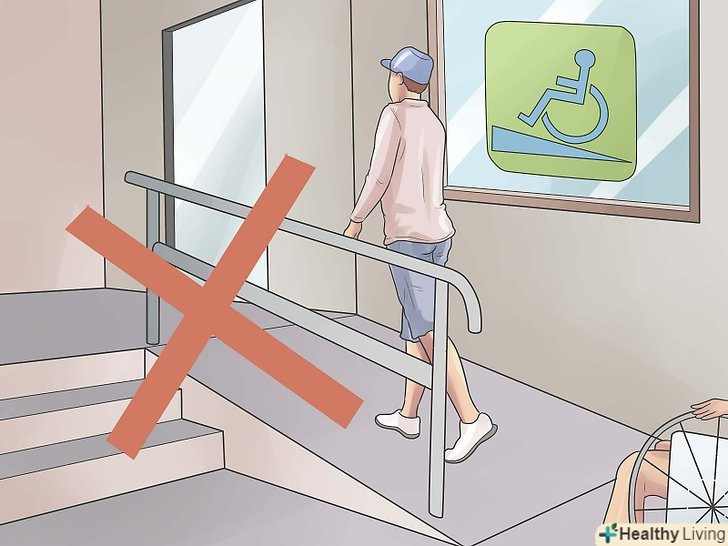 Не використовуйте пандуси для людей з обмеженими можливостями та інше, що призначене для них, якщо у вас все C можливостями в порядку.так, всі ми любимо зрізати шлях до дверей магазину по похилій поверхні пандуса, але все ж варто пам'ятати: коли здорова людина користується тим, що створено для людей з обмеженими можливостями, це виглядає вкрай нешанобливо. Все це потрібно комусь по-справжньому. Повірте, є вагома причина, по якій потреби людей з обмеженими можливостями також враховуються при будівництві та інших діях. Іншими словами, всякий раз, коли ви піднімаєтеся по пандусу, є шанс, що ви тим самим заважаєте піднятися людині з обмеженими можливостями.- У деяких ресторанах є місця для людей з обмеженими можливостями. Навіть якщо вас в ресторан прийшла ціла юрба, не займайте ті місця.