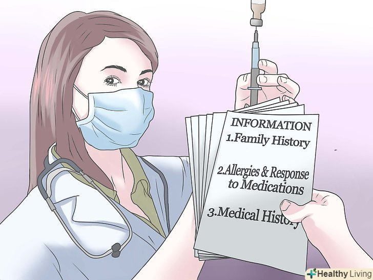 Підготуйте інформацію для вашого анестезіолога.анестезіолог-лікар, який підбирає препарати, які зроблять процедуру біопсії менш болючою для вас. Вам знадобиться наступна інформація[3]:- Випадки захворювань в сім'ї. Анестезіолог повинен знати, чи хтось із ваших близьких родичів мав проблеми з анестезією в минулому. Ця інформація допоможе анестезіологу підібрати для вас правильні препарати, які будуть використовуватися під час процедури.