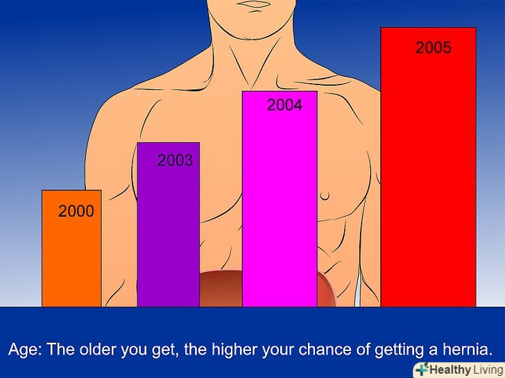 - Знайте, які люди входять до групи підвищеного ризику виникнення гриж.чому грижами страждають більше п'яти мільйонів американців?[13] грижі можуть виникнути з багатьох причин. Ось лише деякі з факторів, які ставлять людей в групу підвищеного ризику:[14]