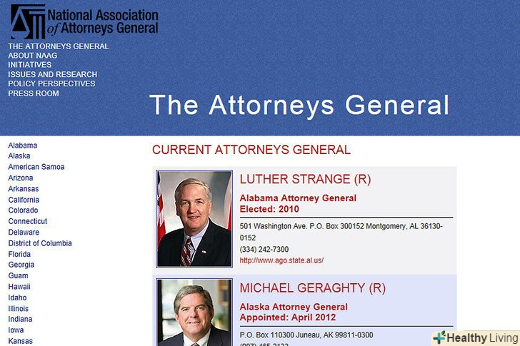 Дізнайтеся в Міністерстві юстиції вашого штату (»МЮ").якщо вам не вдалося знайти рекомендовану форму в законах вашого штату або отримати її в управлінні охорони здоров'я, дізнайтеся в приймальні Міністерства юстиції. У деяких штатах МЮ безкоштовно надають населенню весь пакет з планування порядку розпорядження успадкованим майном і медичного обслуговування. Щоб знайти веб-сайт МЮ вашого штату, відвідайте сайт Національної асоціації генеральних прокурорів за адресою http://www.naag.org/current-attorneys-general.php.