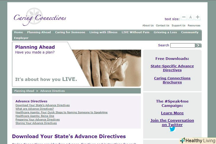 Знайдіть законодавчий акт вашого штату про розпорядження.будь ласка, зверніть увагу, що не у всіх штатах прийняті такі закони. Якщо ви живете в штаті, в якому немає закону про завчасні розпорядження, ви можете розглянути домовленість з представником охорони здоров'я прийняти ваші рішення щодо медичного догляду за вас. Щоб знайти законодавчі акти свого штату, або визначити, що у вашому штаті немає законів щодо розпорядження про підтримку життя:- Відвідайте веб-сайт Find Law. Перелік дійсних вимог кожного штату разом з посиланням на їх законодавчі акти, що стосуються попередньої довіреності про медичне обслуговування і розпорядження про підтримку життя може бути знайдений на сайті Find Law за адресоюhttp://estate.findlaw.com/living-will/living-wills-state-laws.html.
