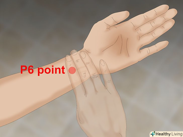 Натисніть на точку P6.подейкують, що ця акупунктурна точка знижує нудоту. Вона знаходиться на внутрішній стороні зап'ястя, трохи вище від поперечної складки на зап'ясті. Багато туристичних магазинів продають браслети з вбудованими кнопками, які натискають на цю точку. Проведені наукові дослідження довели ефективність цього методу при заколисуванні.[10]- Донині точаться суперечки про те, що саме допомагає при нудоті – сама точка тиску або процес натискання на неї.[11] як би там не було, а спробувати варто.