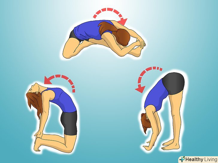 - Прогин вперед з положення стоячи: Встаньте, поставивши стопи разом, а руки звісивши по сторонам. "Вкоренитеся" стопами і на вдиху повільно підніміть руки вгору. На видиху почніть опускати руки вниз і нахилятися вперед слідом за руками до тих пір, поки руки не дістануть до підлоги. Розслабте руки і покладіть на підлогу. Якщо ви не можете дістати до підлоги з прямими ногами, то зігніть ноги в колінах. Затримайтеся в цій позі на 1 хвилину. Не забувайте при цьому спокійною і розслаблено дихати.