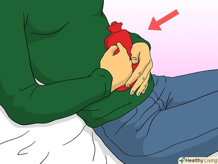 Покладіть грілку на живіт.як і гаряча ванна або душ, тепло, прикладене до живота, допоможе розслабити м'язи і збільшити кровотік в цій області, завдяки чому біль зменшиться. Покладіть грілку або пляшку з гарячою водою, обгорнуту рушником, на живіт приблизно на 15 хвилин.- Ви можете користуватися спеціальним зігріваючим пластиром, якщо перебуваєте в русі. Суворо дотримуйтесь інструкцій виробника, щоб уникнути опіку, подразнення або пошкодження шкіри.