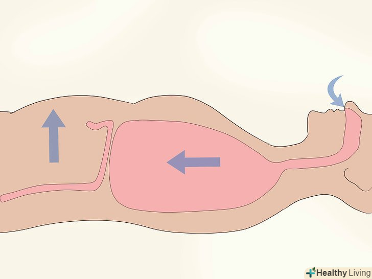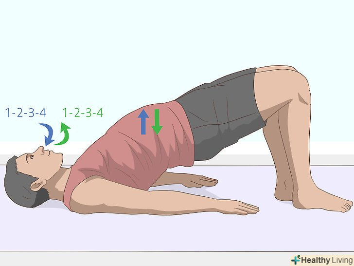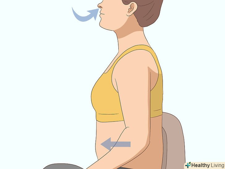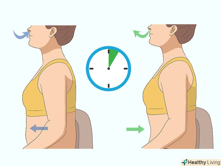 Дихайте глибокоЗа допомогою діафрагми і збільшуйте обсяг живота.Так як діафрагма — це м'язова перегородка під легкими, при глибоких вдихах вона опускається і звільняє місце для збільшення обсягу легенів. Глибоко вдихніть через ніс так, ніби потрібно наповнити повітрям нижній відділ живота. Ви відчуєте, як живіт збільшиться в об'ємі при такому вдиху.[8]- Дихання занадто поверхневе, якщо живіт не збільшується.