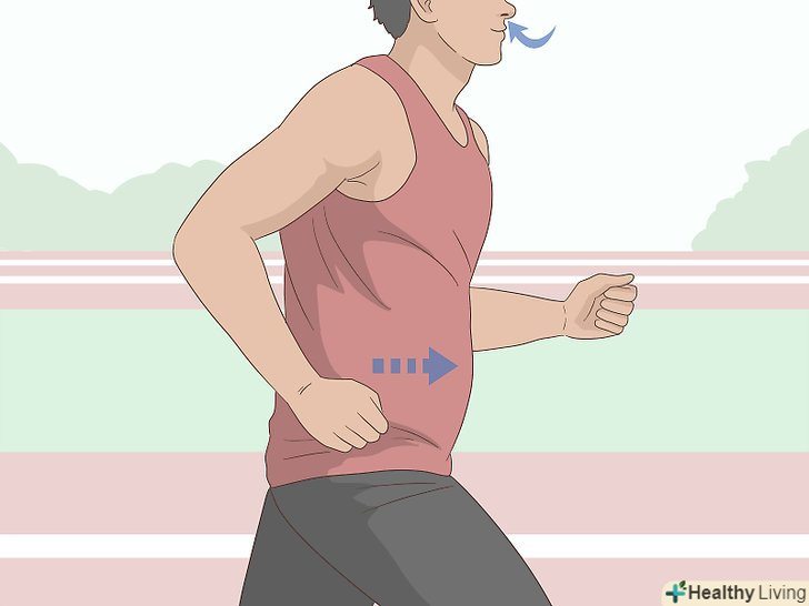 Глибоко дихайте животом під час бігу.під час бігу важливо глибоко дихати, щоб насичувати легені киснем, який дає вам сили. Якщо ви дихаєте поверхнево, почніть дихати за допомогою діафрагми і стежте за животом.[15]- Якщо вам складно робити рівномірні глибокі вдихи в процесі бігу, то експериментуйте з різним дихальним ритмом і виберіть найбільш зручний варіант. Наприклад, можна робити одноразовий глибокий вдих і двічі видихати через рот.