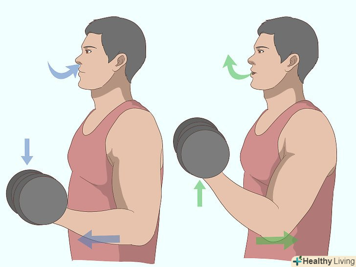 Ритмічно дихайте під час силових тренувань.правильне дихання під час таких вправ корисно для організму і запобігає ускладненням на зразок грижі. Замість переривчастого дихання при підйомі важких предметів і інших силових вправ спробуйте видихати на зусилля і вдихати на розслаблення.[18]- Наприклад, під час вправи на біцепс видихайте під час підйому штанги або гантелей і видихайте, коли руки опускаються вниз.