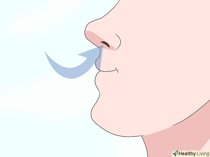 Вдихайте через ніс, а не через рот.при вдиху через ніс повітря очищається від дратівливих речовин. Також регулюється температура вдихуваного повітря. Якщо ви зазвичай дихаєте через рот, то потренуйтеся закрити рот і вдихати через ніс. Видихати можна будь-яким зручним для вас способом.[2]- Якщо ви звикли дихати ротом, то, можливо, спочатку виникнуть труднощі, але з часом стане легше.