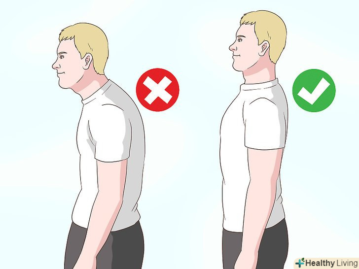Слідкуйте за поставою і не напружуйтеся.якщо сутулитися і напружуватися, вам буде складно робити глибокі повні вдихи. Станьте рівно, розслабте плечі і суглоби.[3]- Спробуйте злегка нахилитися вперед і підняти плечі до голови і зробити глибокий вдих. Потім станьте рівно, розслабте плечі і ще раз глибоко вдихніть. Зверніть увагу на те, наскільки легше дихати з правильною поставою і розслабленими м'язами.