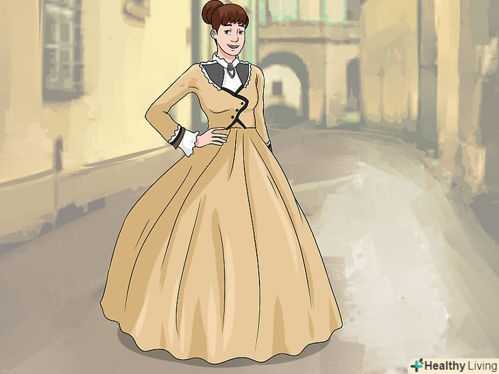 ОдягнітьСтаромодний одяг обраної ери.зберіть в мережі інформацію про те, що надягали люди в обраний вами період часу. Деякі сайти навіть описують, як змінювалася мода з плином часу, тому вам буде досить просто знайти дані про те, як вам слід вбратися. Відповідний старомодний костюм можна придбати в інтернет-магазині, в магазині карнавальних костюмів або у торговців вінтажними товарами.[2]- Припустимо, що ви вибрали персонажа з XIX століття. В цей час жінки носили облягаючі сукні з довгими струмливими спідницями. Чоловіки ж одягалися в однобортні піджаки і штани.