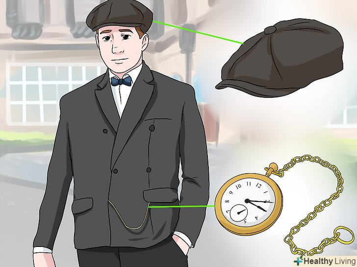 Доповніть образ старомодними аксесуарами.зупиніться біля крамниці, що торгує вінтажними товарами, і підберіть собі кілька старомодних аксесуарів. Також їх можна буде придбати через Інтернет. Якщо ви не хочете, щоб ваш костюм повністю відповідав обраній Ері, то використання декількох старомодних аксесуарів в поєднанні з сучасним одягом може стати тонким натяком на те, що ваш персонаж відноситься до іншого періоду часу.- У минулому були популярні пенсне і кишеньковий годинник на ланцюжку. Спробуйте доповнити ними свій вигляд, щоб створити образ безсмертного персонажа.[6]